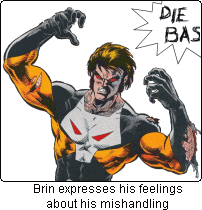 Dr. Londo's android assistant, Karth Arn, who had obtained Londo's zuunium, was jealous over the attention and powers Brin received; consequently, after Mar's death, Arn induced amnesia in Brin and convinced him that he was the android and Arn the human son. Brin ran away from home and, calling himself Lone Wolf, began performing a number of heroic deeds across the galaxy, including Metropolis, where he encountered the Legion. With their help, he eventually discovered his true origins, and the Legionnaires - particularly Light Lass, who had become infatuated with him - encouraged him to seek therapy. After having his mental faculties completely restored, Brin joined the Legion Academy, where he could further train himself alongside his roommate, Chemical King. He helped the Super-Heroes break down the Legion of Super-Villains from within and was awarded Legion membership under his new name, Timber Wolf. Brin has never been the most communicative of Legionnaires, and his recent breakup with Lightning Lass seems to have stemmed partly from his inability to express himself verbally, which has previously led to some personal problems, including a short period of drug abuse. Timber Wolf has always had a special bond of friendship with Saturn Girl. Hur, hur... special bond of friendship? Yeah, right. Including perfectly innocent games of tonsil hockey on remote asteroids. Hur, hur! Powers and Skills So pretty, much "bog-standard" super-powers, hardly imaginative, not like turning into a rubber ball or shouting at things, for example. How he managed to side-step the power duplication prohibition and join the Legion is anyone's guess. While hardly in the a-list he's a true "b-list" heavy-weight in and easily able to take out the likes of Dream Girl. First Appearance ADV 327. And now for my two penn'orth... Brin has the dubious distinction of being the most mucked about character outside the Superboy pantheon. Despite a promising start as one of the few not to fall over himself to accept Legion membership (at least initially), Brin has been portrayed largely as a second-rate Wolverine knock-off with a dumb jock image even worse than Jo (UltraBoy) Nah's. Lazy writing syndrome lead to his codename dictating his behaviour.